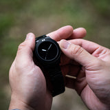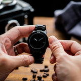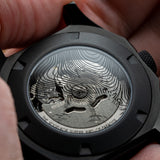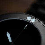 The smart tapping and rapid dance moves of the Vogelkop Superb Bird-of-Paradise (Lophorina niedda) inspired this Musou Black timepiece, our second creation in the series. Ultra-dark and determined for a challenge, the dial face resembles the Vogelkop Superb’s striking black plumage, while two iridescent green-blue dots on the bezel represent its majestic eyes. We only hope you don't have to work as hard to court a fellow watch-lover.