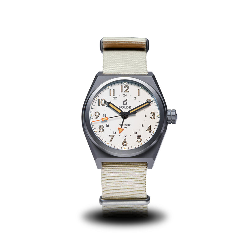 What can we possibly add to a classic watch? It's simple. A little complication that let's you track two time zones simultaneously. The Venture GMT is powered by a Swiss Ronda Quartz movement and rated for a dive-friendly 200m water resistance. Available in 4 handsome dial options with an orange GMT hand, get set to jet set with this beauty.