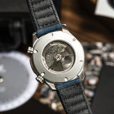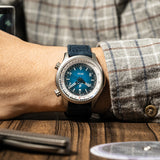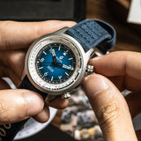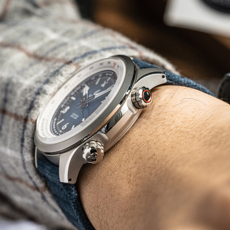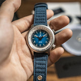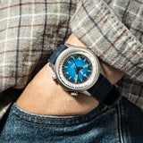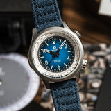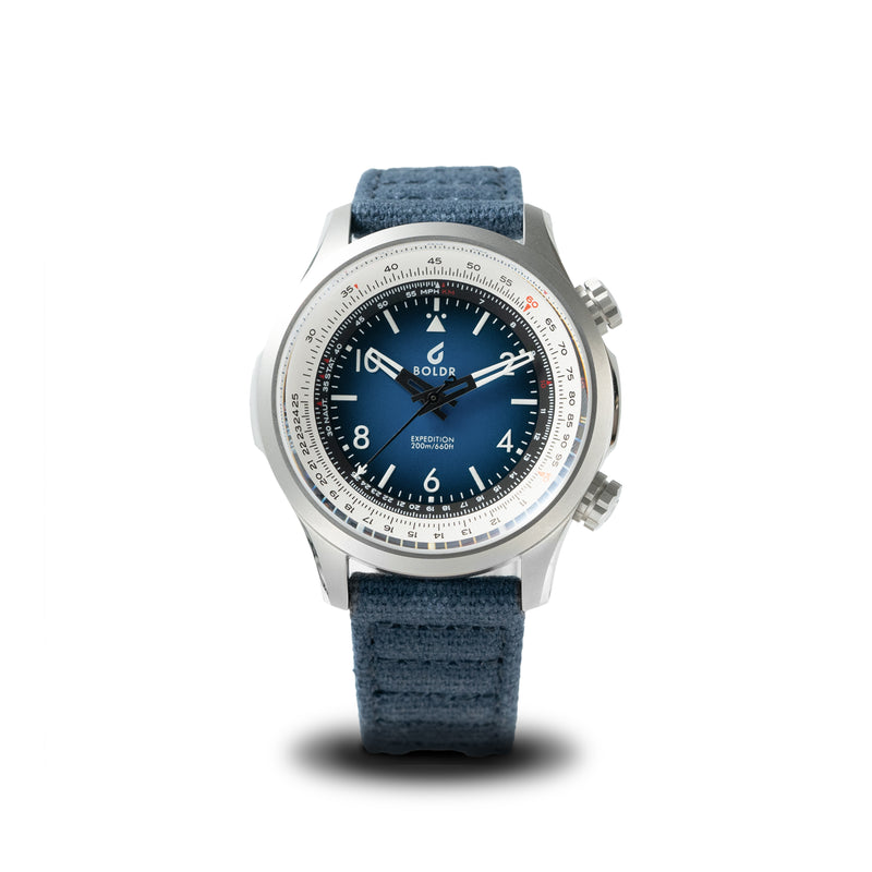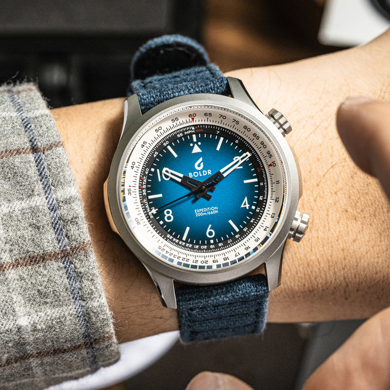 So far, I am loving the watch. It can be a bit of a challenge for the eyes reading the measuring dial, but it has proven fun to use. If I had any feedback on the face itself, it would for next iterations to use more of a point for the hands, especially since the seconds hand sits above the minute ticks. But it is a minor thing, but hasn’t detracted from the use or great looks. Did not care for the strap. The holes did not suit my wrist size, and the blue was too washed out to suit the dynamic color of the face. Switched to a more vibrant blue rubber strap, and now wear the watch with pride.