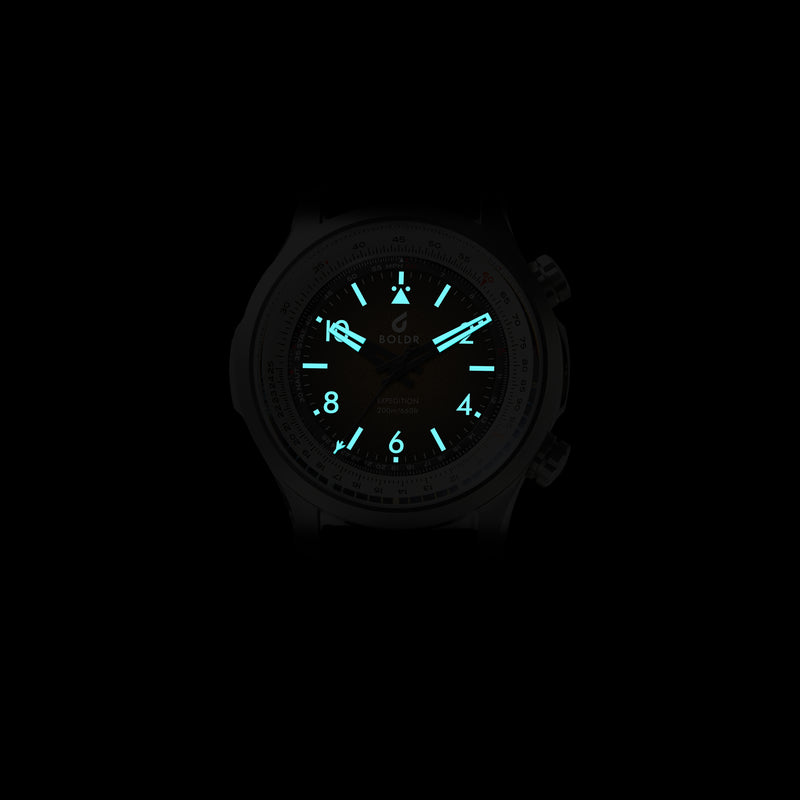 • Crown: Dual screw-down crown with custom embossed BOLDR logo
