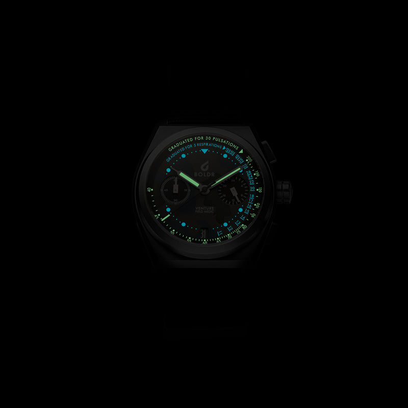 Use the precisely graduated markings on the dial to count off heart and respiratory rates within a matter of seconds. When activating the chronograph, we'd recommend counting using 30-second intervals for higher accuracy.