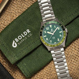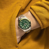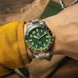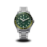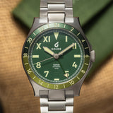 - Dial: Half-Arabic, half-Roman numerals (California dial), matt green