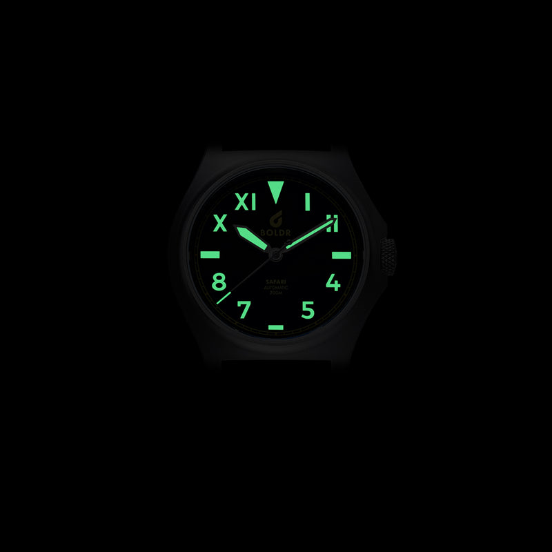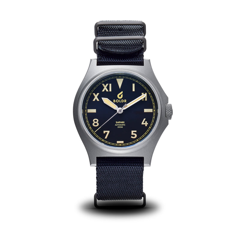 This Safari Ranger is a compact beast forged with stainless steel and a determination for exploration. Measuring 40mm across your wrist, it has the simple elegance of a field-style tool watch.