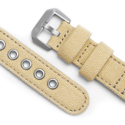 Beautiful hand-stitched canvas watch strap with custom metal rivets for extra durability. The strap is stitched with a matching colour thread.