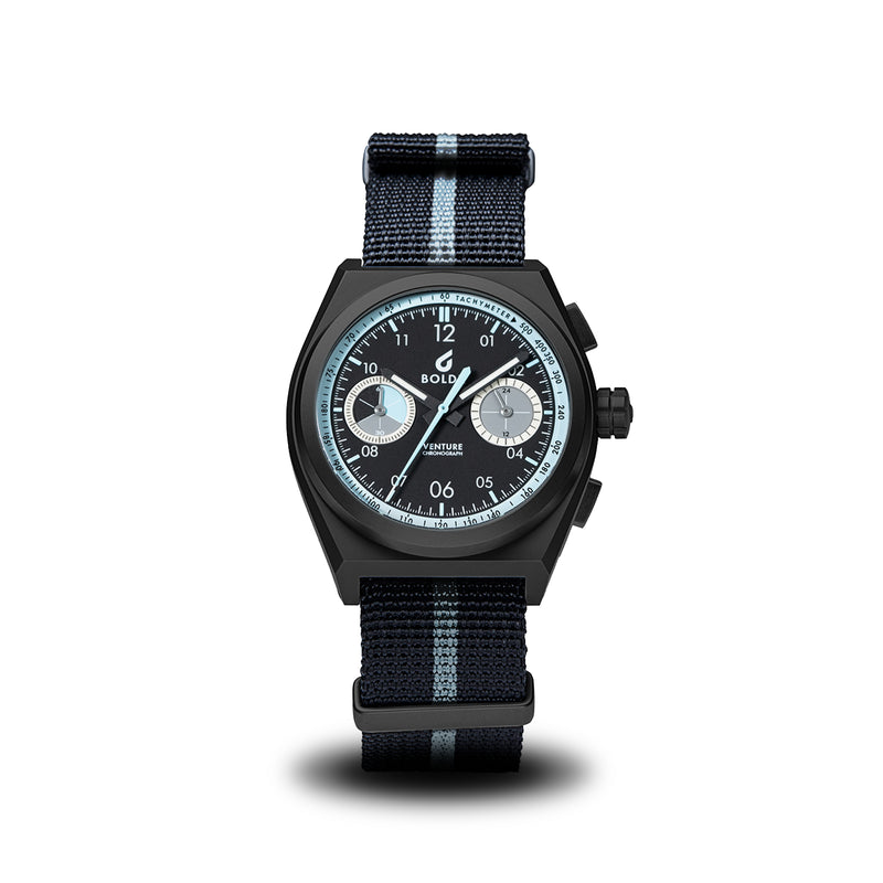 Powered by the dependable Japanese SII VK64 mecaquartz movement, it comes housed in a full titanium case and paired with a rugged nylon strap for a secure, comfortable fit. It carries forward the Venture series’ field-tested reliability while adding a bold chronograph punch—perfect for both the race track and everyday adventures.