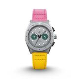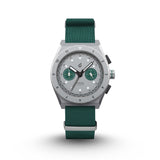 This rugged 41mm titanium chronograph is powered by a Seiko VK64 meca-quartz movement, combining the tactile feel of a mechanical chronograph with the accuracy of quartz. It features a matte grey dial with twin green sub-dials and a subtle “CONQUER” signature at 6 o’clock — a quiet nod to the mission behind the design.